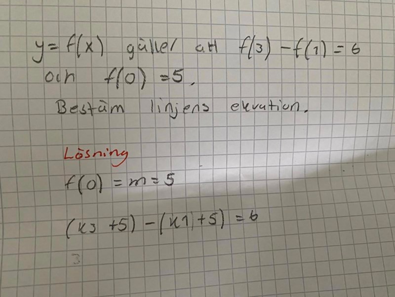 Nu kan vi hitta ett uttryck med endast en okänd variabel (k) för f(3) och f(1). Vilka uttryck är det? :)Är det inte då 6=3k+5 och 6=1k+5?