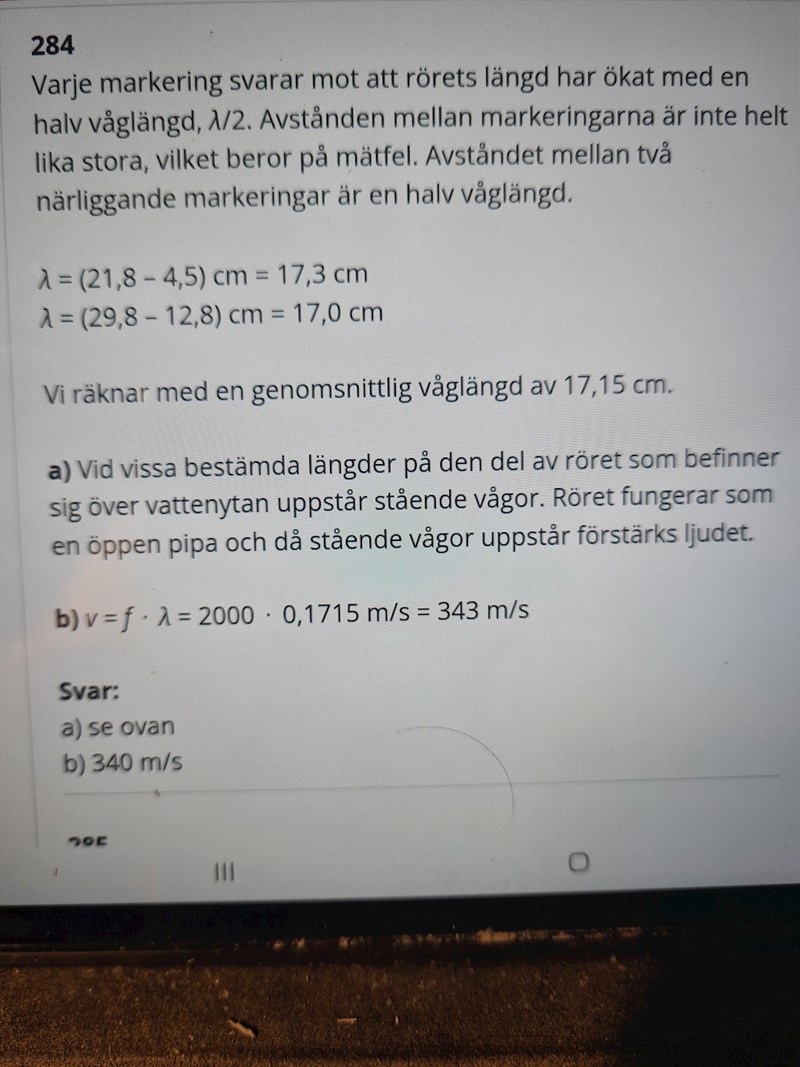 Facits lösnings skiljer sig litegrann från min lösning dock. Facit får fram att hastigheten är 343 m/s och tar endast med den genomsnittliga våglängden av två värden. Varför gör den det?