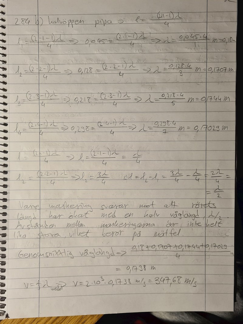 Vore det korrekt att i en sådan uppgift beräkna den genomsnittliga våglängden som jag gjorde för att beräkna ljudhastigheten? Jag beräknade våglängderna för alla fyra längder (man kan betrakta glasröret som en halvöppen pipa) och därefter multiplicerade jag med stämgaffelns frekvens som är 2000 Hz som gav ljudhastigheten ca 348 m/s (347,68 m/s)