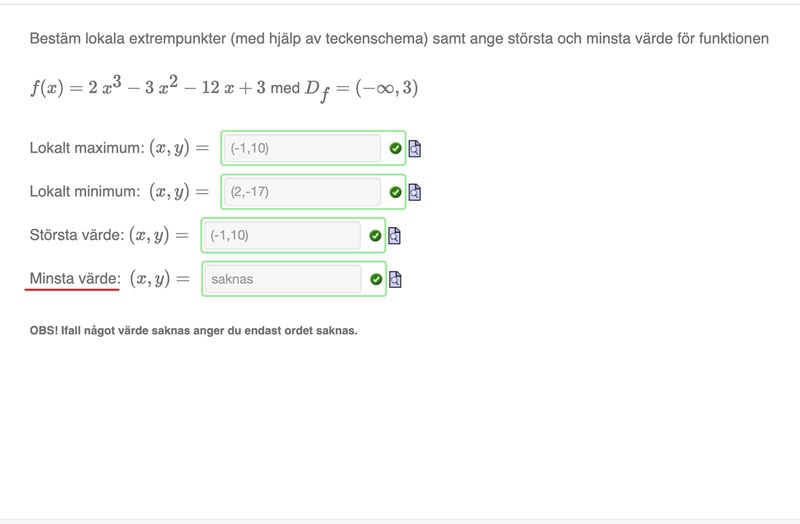 Bestäm lokala extrempunkter samt ange största och minsta värde för funktionen.