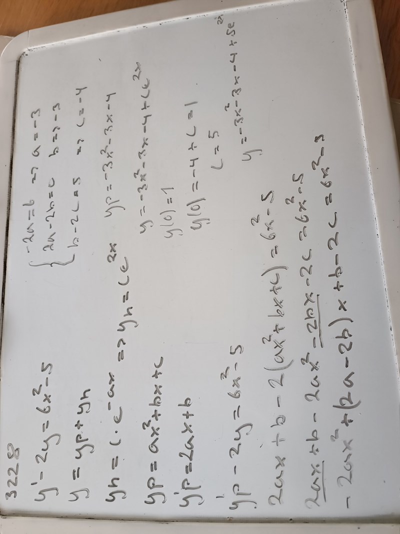 Bestäm den lösning till y'-2y=6x^2-5 som uppfyller villkoret y(0)=1
