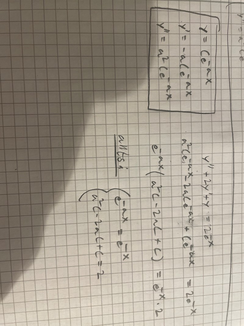 partikulär lösning: kan inte lista ut denna. Har ansatt att y=Ce-ax men det slutar i ett ekvationssystem där 0=2