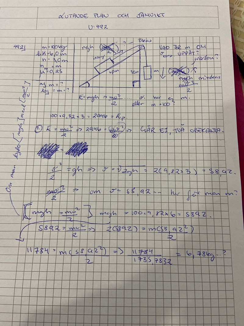 jag vet jag vet lösningen är väldigt konstig men det jag basically gjort är att jag betraktat hypotenusans energi med mgh (då den växer?) och mv^2/2 vid närliggande katet. jag vet vad mgh är och räknade ut det. sedan när jag räknade med energiprincipen ( Ek = Ep ) fick jag att v = 58.92. sedan räknade jag ut Ek = mv^2 och bröt ut m. Jag tog slutsatsen om att potentiella energin och kinetiska energin bör vara densamma vid alla ställen, och tog Ek = Ep. Jag bröt sedan ut m ur formeln och fick att