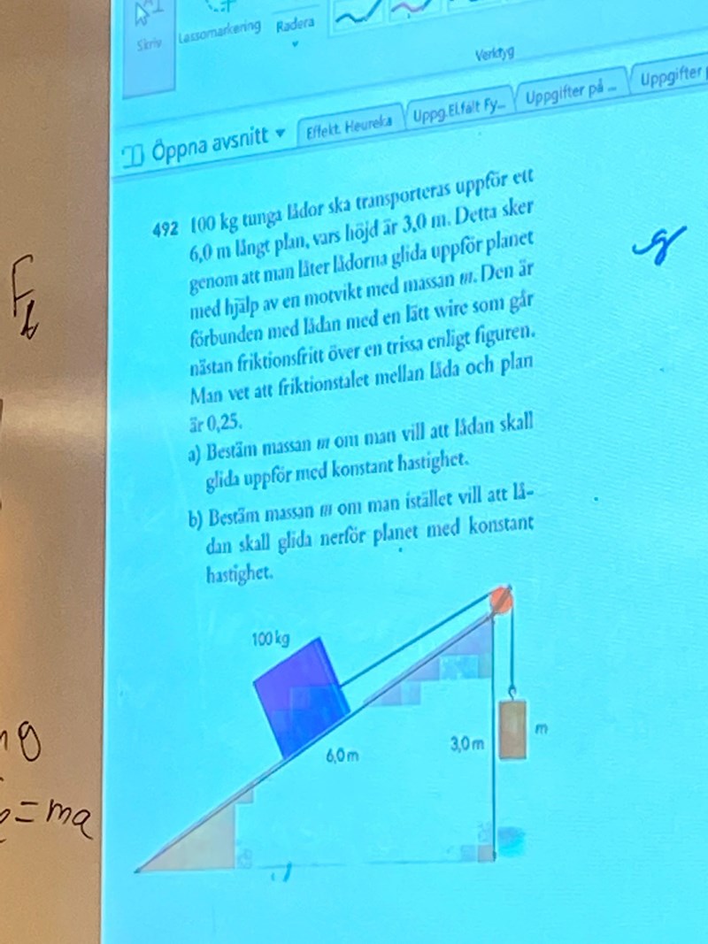 jag vet inte riktigt om mitt svar stämmer men det låter ju förfärligt orimligt då vikten på blocket på det lutande planet är 100 kg …