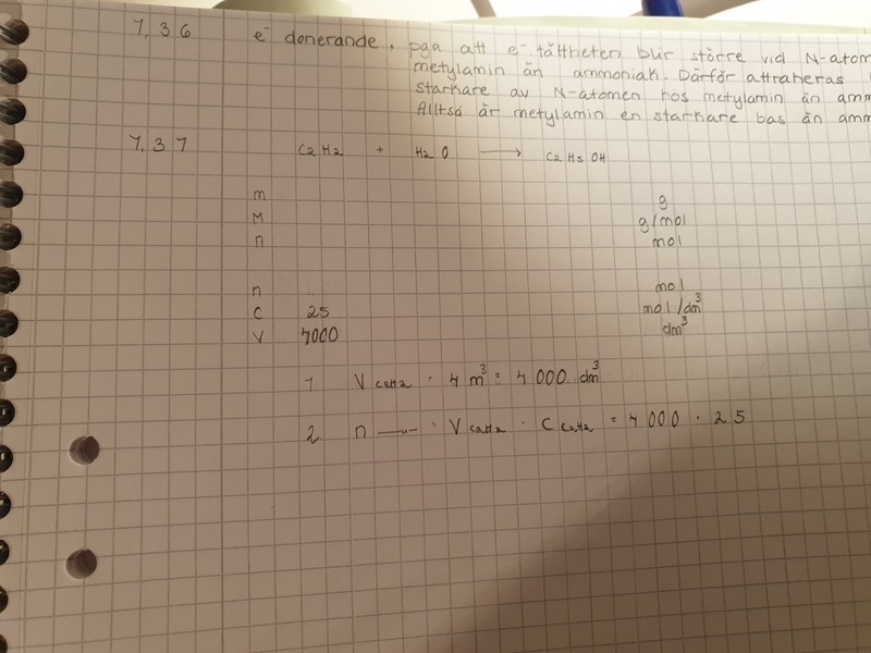 mag1 skrev:Börja med att räkna ut hur många mol etyn som finns i volymen 4 m3 (uppgiften anger hur stor volym en mol etyn upptar). Då vet du hur många mol acetaldehyd som kan bildas, men utbytet är lägre än 100%. Efter att ha korrigerat antalet mol för utbytet vid denna reaktion, kan vet du hur många mol etanol som kan bildas - som du får räkna om till massa.