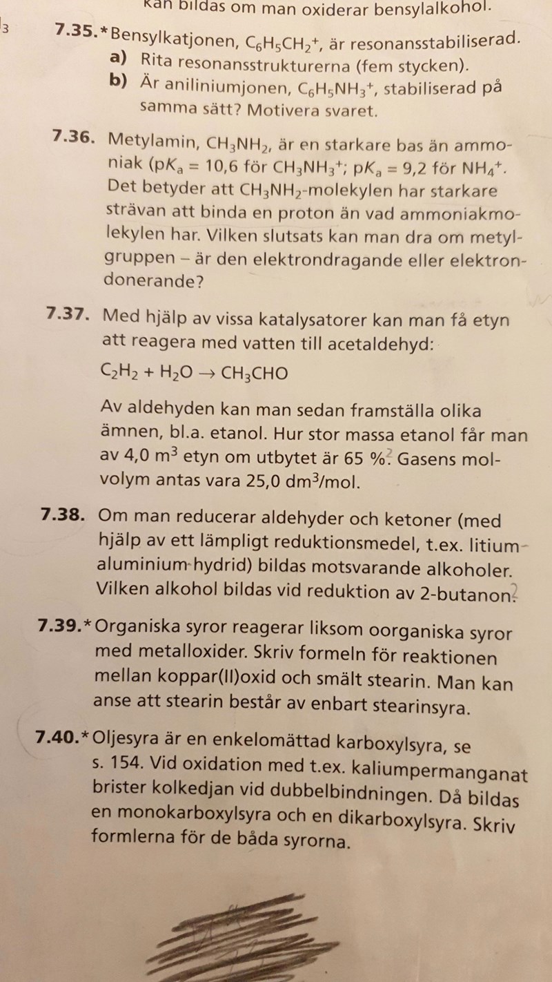 Totyn skrev:mag1 skrev:Börja med att räkna ut hur många mol etyn som finns i volymen 4 m3 (uppgiften anger hur stor volym en mol etyn upptar). Då vet du hur många mol acetaldehyd som kan bildas, men utbytet är lägre än 100%. Efter att ha korrigerat antalet mol för utbytet vid denna reaktion, kan vet du hur många mol etanol som kan bildas - som du får räkna om till massa.