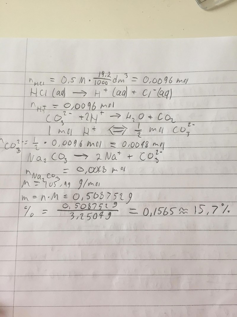Du har beräknat substansmängden för natriumkarbonat i 3,2504/4 g, inte i 3,2504 g.