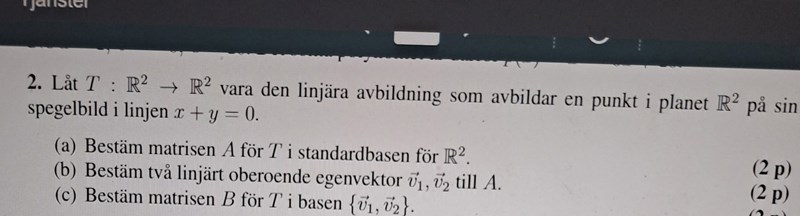 Så den här uppgiften handlade om speglingen y=-x typ vilka baser vi får ? Vill gärna förstå varför du fick som du fick... Varför kan man ej tänka att vi har T(1 1) = [1 0] och sen T( 1 1 ) = 0 1 och sen skapa en matris A för det som man gjorde i en uppgift jag la upp på pluggakuten förut?