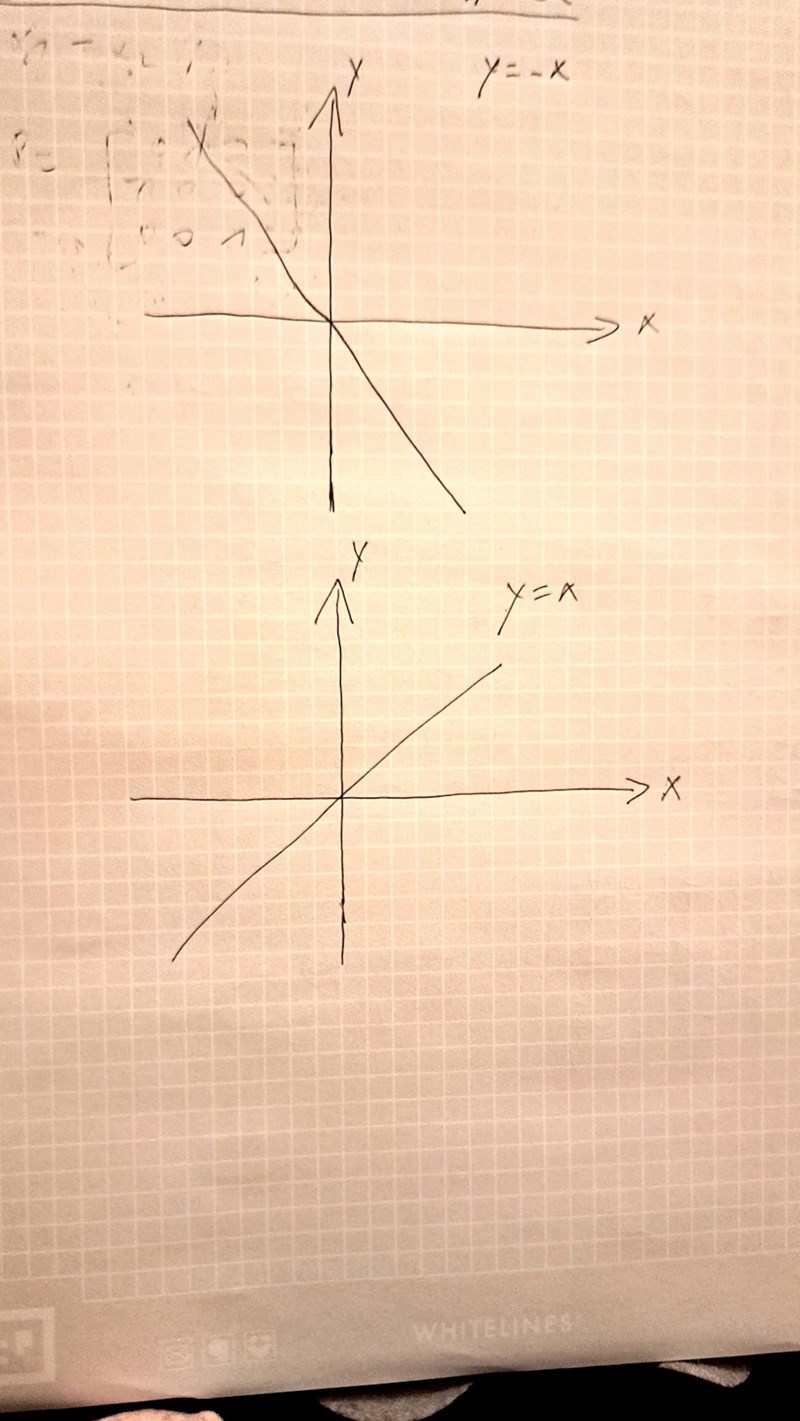 Jag ritade faktiskt men får ej riktigt ihop detta. Första bilden är y =-x för standardbaserna [1 0 ]och [0 1] medan andra bilden samma sak fast då är det [ 1 0] och [ 0 -1]