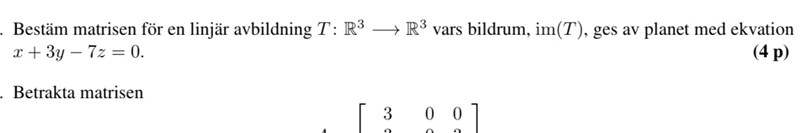 Planet spänns upp av Så då är avbildningsmatrisen de tre men i en matris. Sådär nu blev det rätt. Den tredje kan då vara vad som helst, bara det är en l.komb av de föregående två så att dim(col(a))=2.