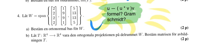 När det kommer till en vektors ortogonalprojektion på ett underrum så är det bara att summera vektorns ortogonalprojektioner på underrummets basvektorer, OM dessa är en ON-bas, dvs räkna ut för alla som är basvektorer till W och sedan summera dessa.