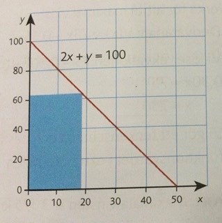 Bestäm maximala arean för en rektangel där ett hörn ligger på linjen 2x+y=100, som på bilden.