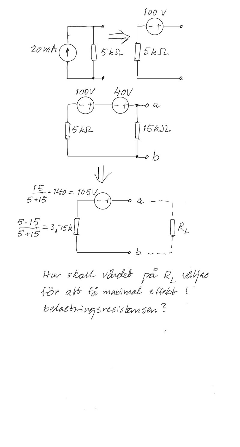 Jan Ragnar skrev:Jo, maximal effekt i belastningen fås för RL= 3,75 kΩ. Spänningen över lasten är då 52,5 V så maxeffekten blir 0,735 W.