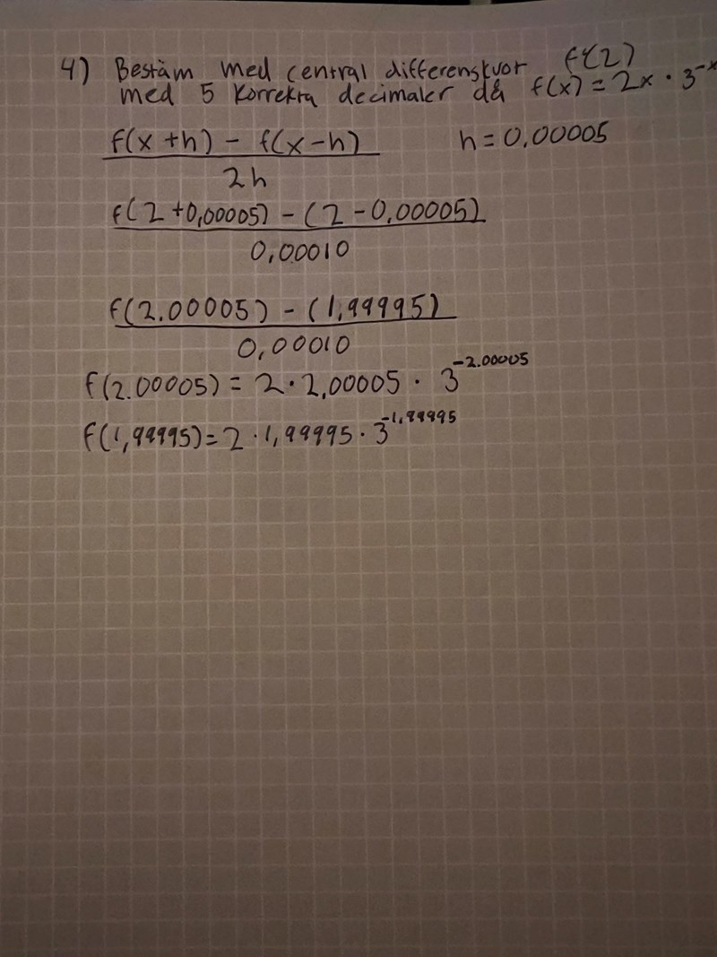 Bestäm med central diff.kvot f'(2) med 5 korrekta decimaler då f(x)=2x*3^-x