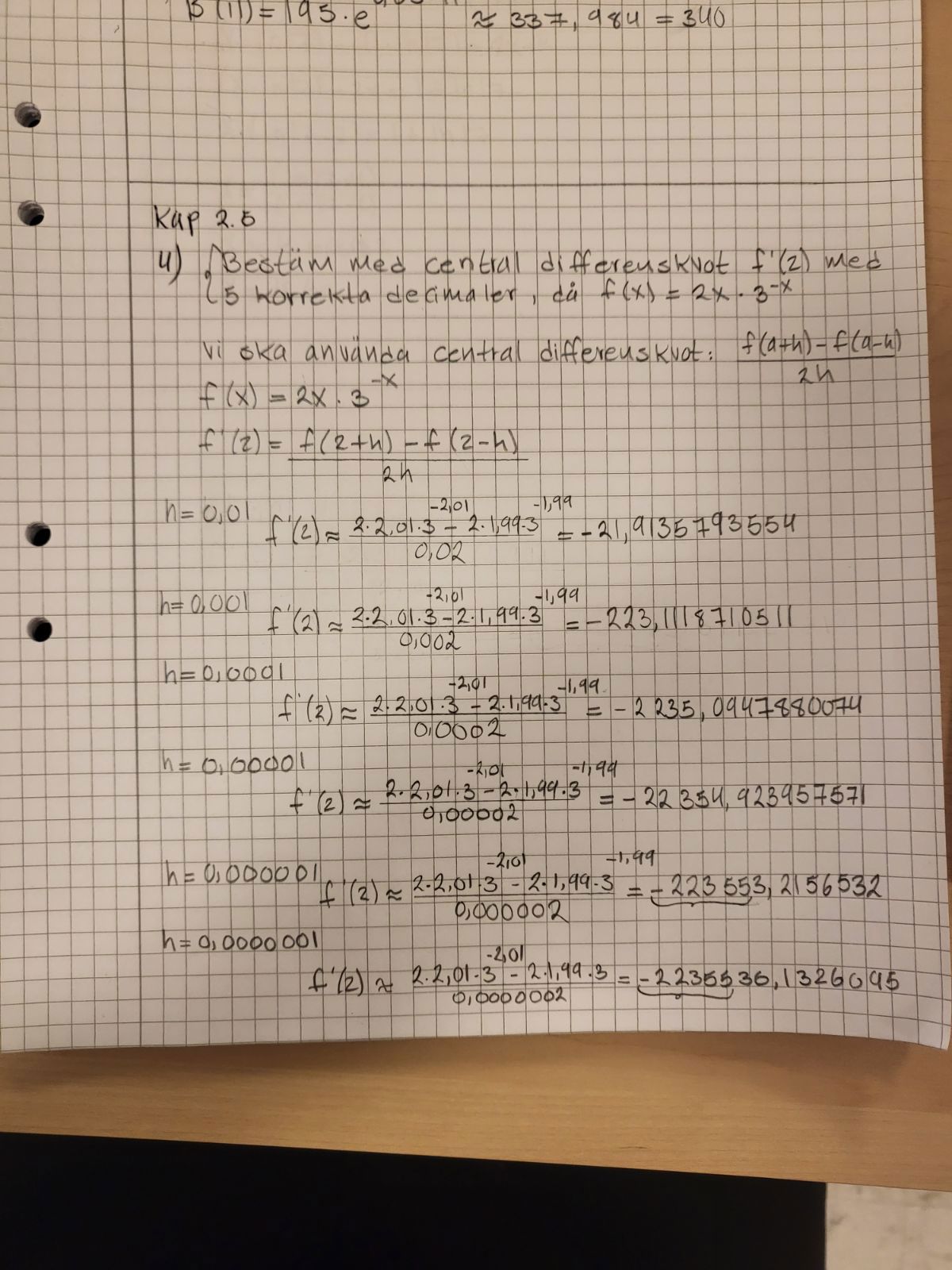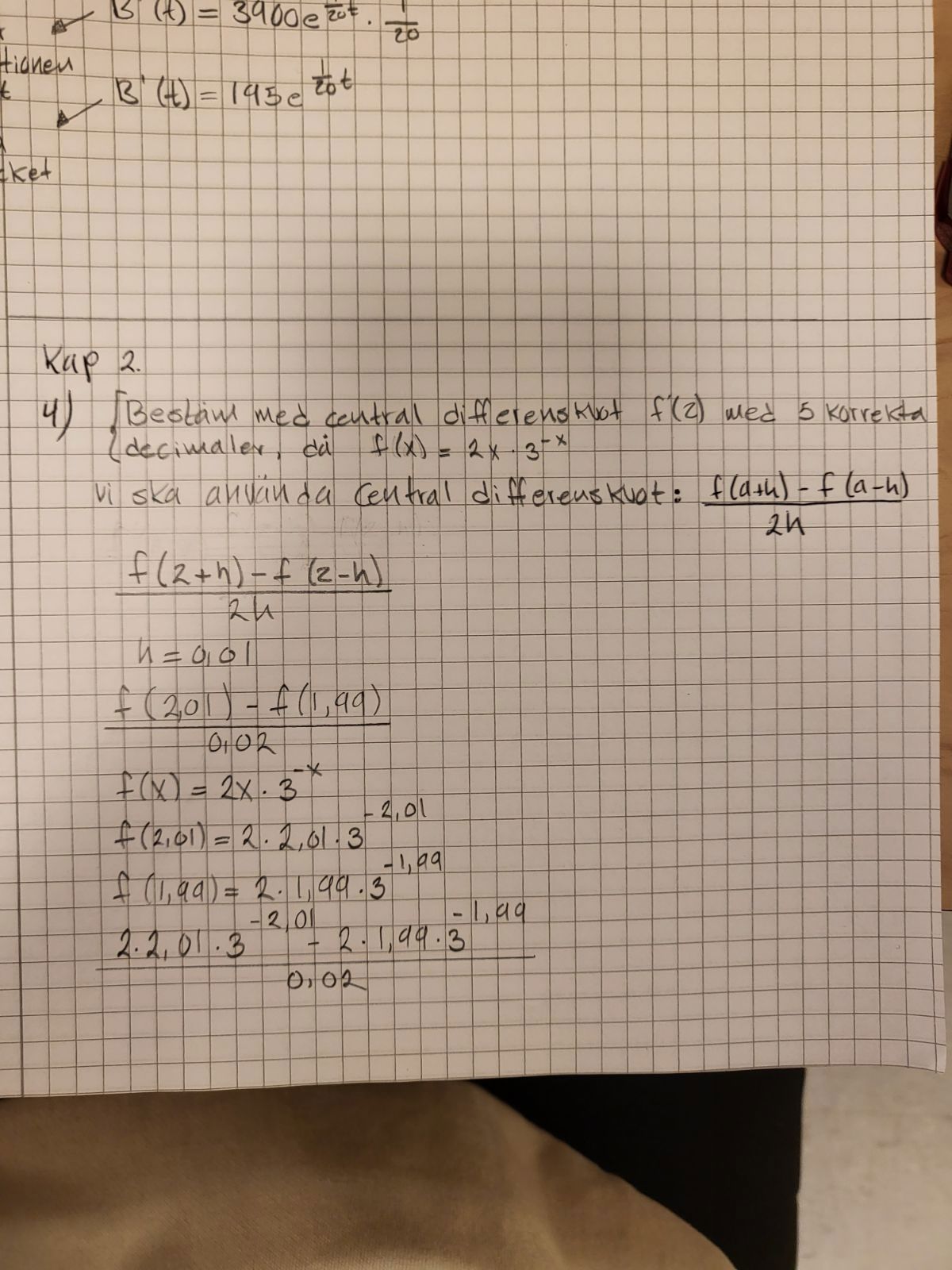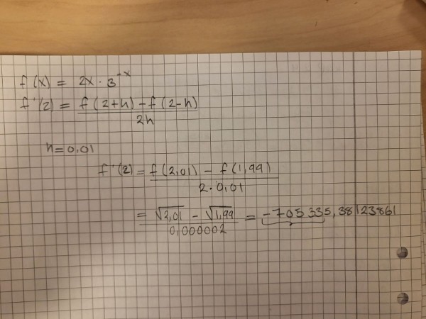 Bestäm med central differenskvot f´(2) med 5 korrekta decimaler, då f(x)= 2x*3^-x?