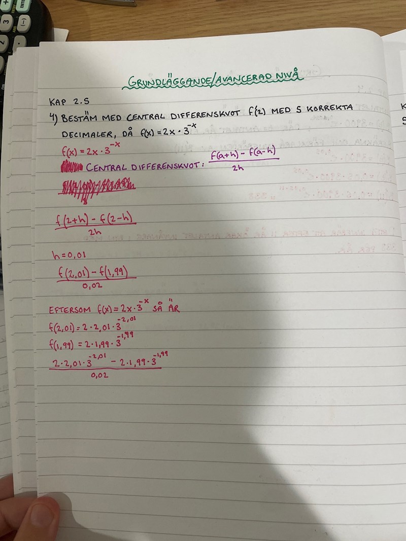 Bestäm med central differenskvot f’(2) med 5 korrekta decimaler, då f(x)=2x*3^-x