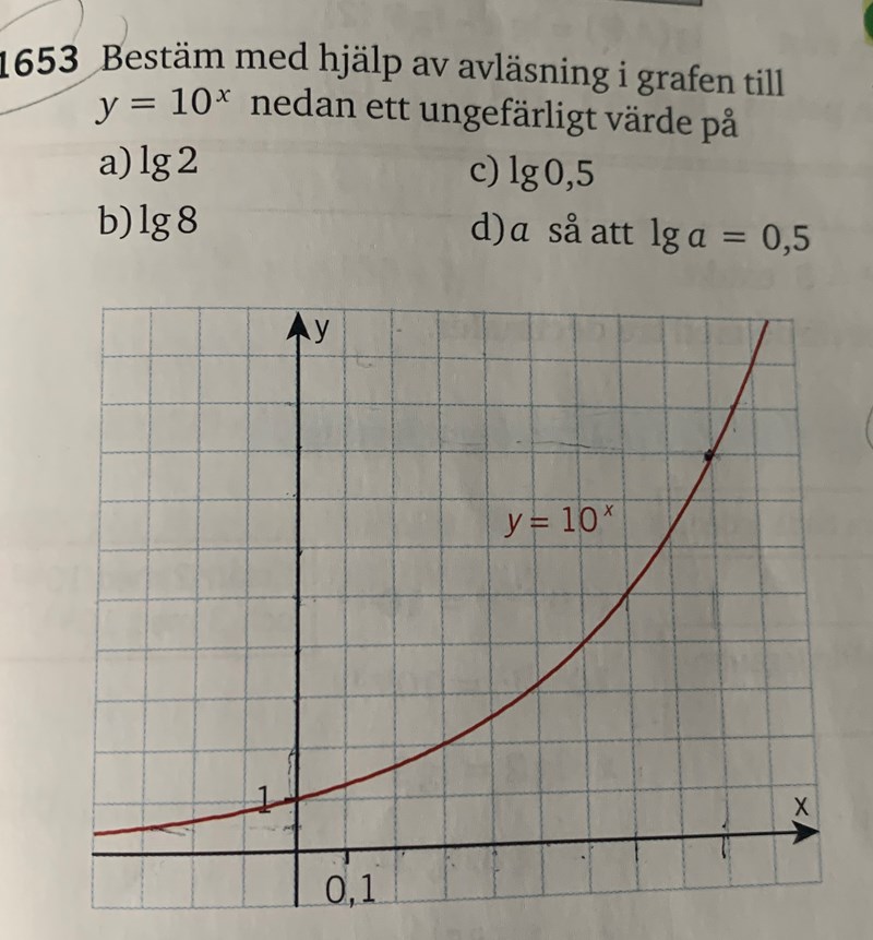 På d) antar jag att 10^0,5 är hälften dvs 5 och när y=5 är x=0,7? Men i facit står det a=3,2?