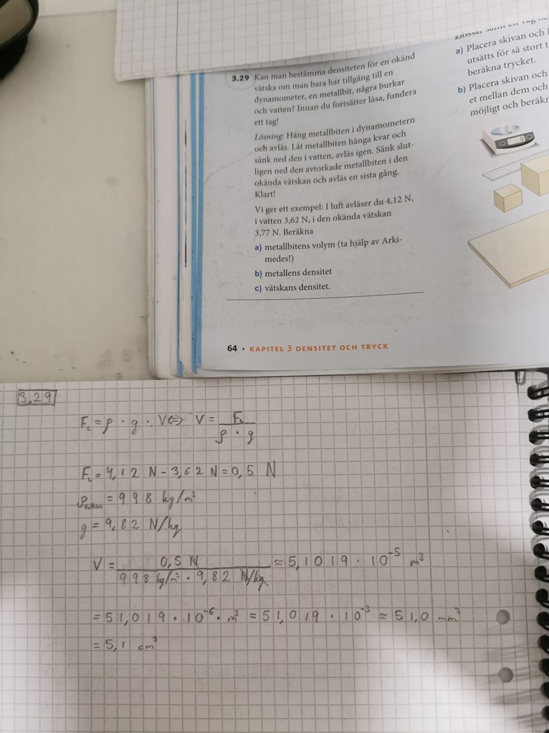 Jag ska räkna uppgift 3.29a och har gjort det som står i det rutiga blocket och fått svaret 5.1 cm³ men i facit står det att det ska vara 51 cm³. Vad har jag gjort för fel?