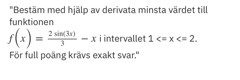 Men minsta går att förenkla, eftersom det var en minpunkt som har med sin() att göra är vinkeln en av de som är kända. Du fick ju x som en extrempunkt så troligt att det är "känd" vinkel inblandad.