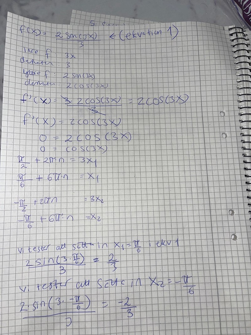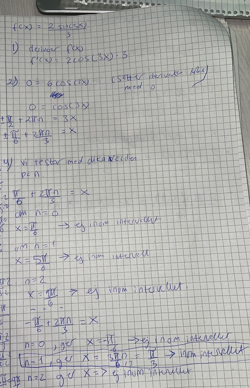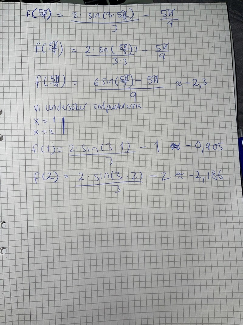 ja, vid exempelvis x=pi/9 fås det största värdet på funktionen f som är bla. bla. Kom ihåg att skriva värdet på f också, t.ex att det minsta värdet är f(-pi/9)=bla. bla.