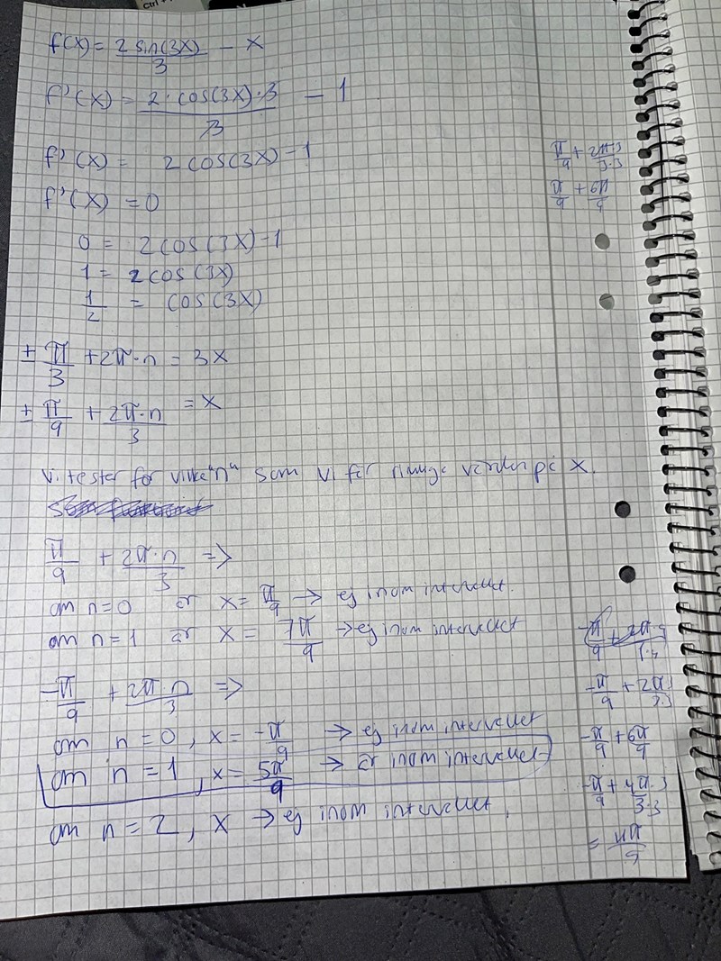 Är det rätt att isåfall svara att då x=pi/9 fås det största värdet medans då x=-pi/9 fås det minsta värdet?