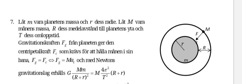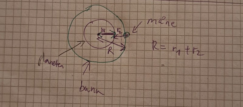 I lösningsförslaget adderar de R och r. Jag är ej med på varför de gör det? Avståndet mellan planeterna är väl R^2? Varför är R+r samma radie för centripetalkraften?