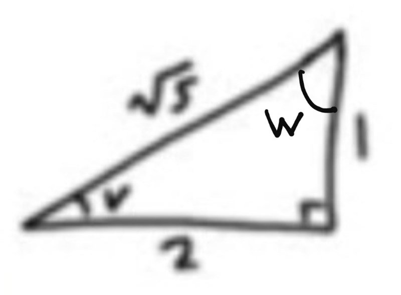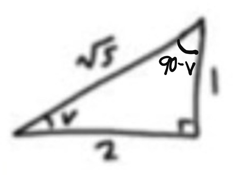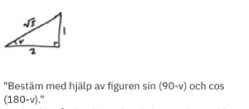 Då blir tredje vinkeln 180-90-v = 90-v. Vilket är den vinkel du ska ber sin för. Kan du se i figuren vad det blir?
