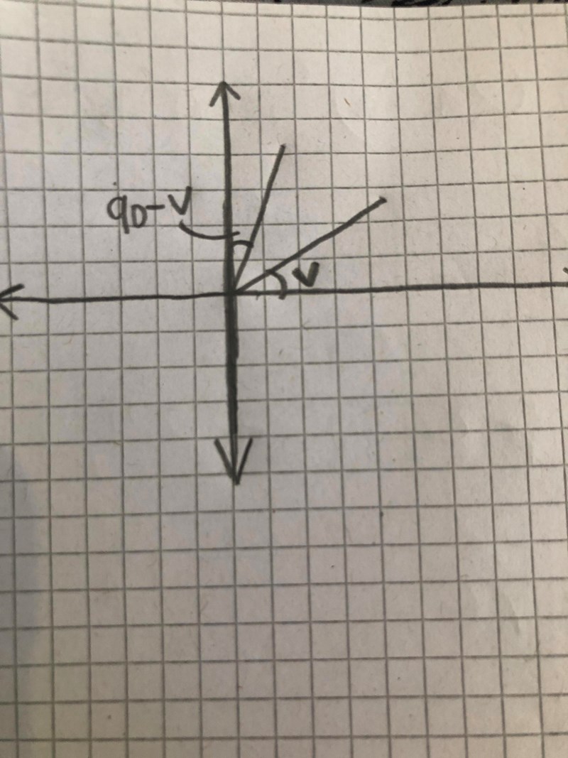 Varför blir den övre vinkeln i triangeln 90-v? Edit . Ok nu fattar jag varför. Men vad ska jag sen göra?