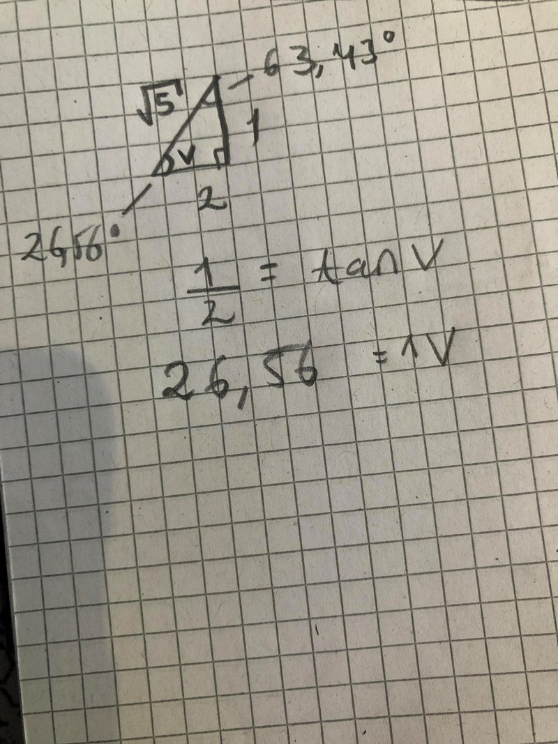 Okej. Jag räknade ut att vinkeln överst är 63.43 grader. Alltså bör det bli 90-63.43=26.57 grader