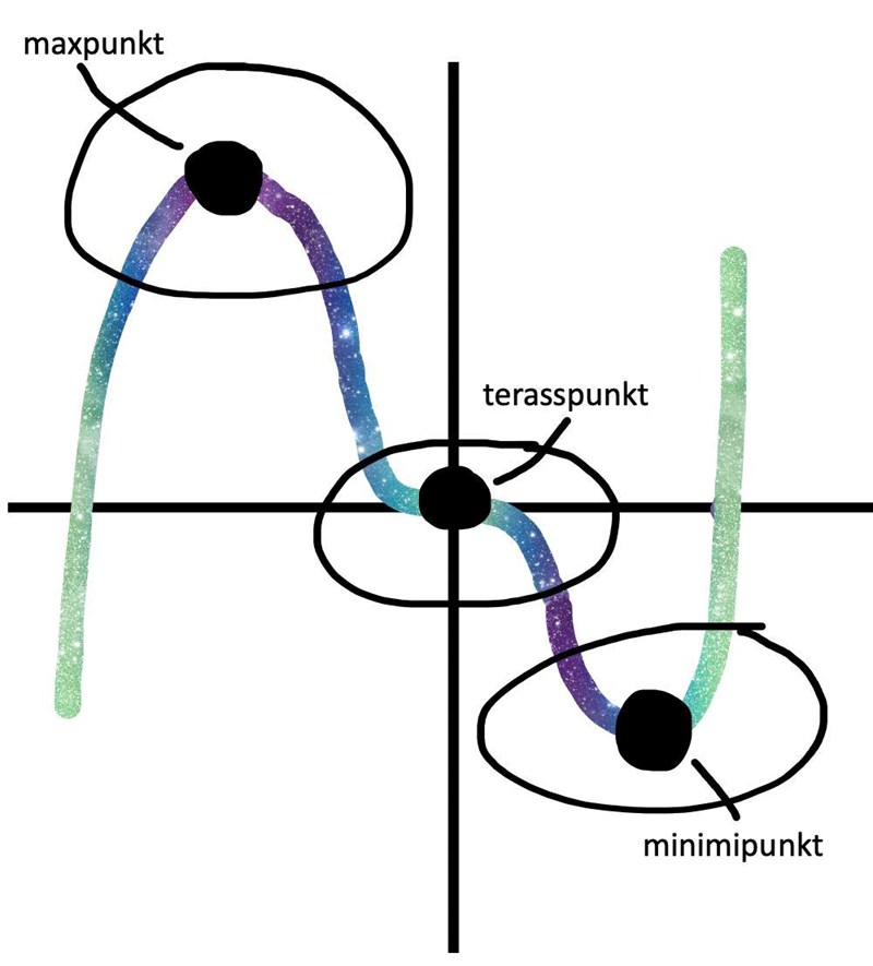 Lutningen (derivatan) i minimi-, max- och terasspunkter är noll. Om vi drar en tangentlinje i dessa punkter har dessa linjer alla k-värdet noll. Skillnaden mellan de tre punkterna är deras utseende. Här har vi en ful skiss som visar skillnaden: