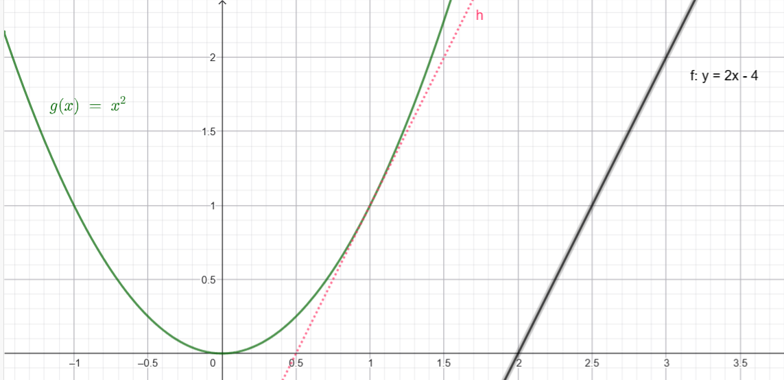Bestäm minsta avståndet mellan grafen till funktionen g(x)=x^2 och linjen y=2x-4