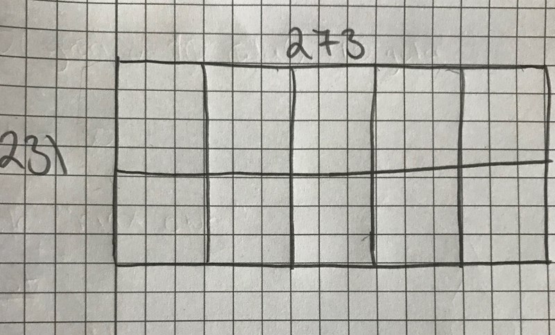 Ta SGF, det är sidan på en kvadrat. Hur många kvadrater är det längs 273-sidan, och hur många längs 231-sidan?