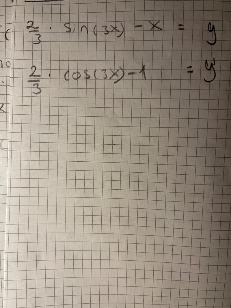 Här ser du f(x) (den röda) och dess derivata f'(x) i intervallet