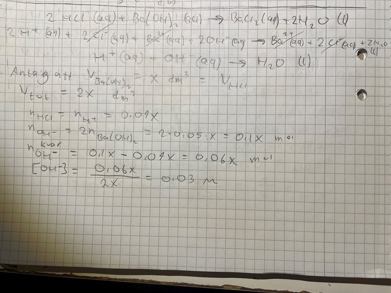 Lika volymer 0,50 mol/dm3 bariumhydroxid och 0,40 mol/dm3 saltsyra får reagera. Bestäm molariteten hos alla de joner som finns i lösningen efter reaktionen.