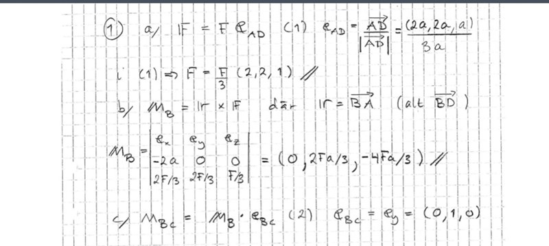 Momentet kring en punkt på axeln är redan beräknat i uppgift b. Det som saknas här är riktingsvektorn som axeln har, dvs e(BC) vilket blir (0,-2, 0)* 1/sqrt(2).