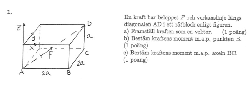 De vill ha momentet kring BC, vilket fås genom att hitta momentet kring en punkt på axeln BC och sedan multiplicera med riktingsvektorn som axeln har.