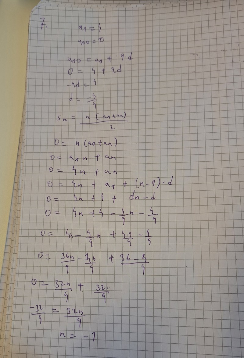 Ja om vi fick ut n=-1 så ska ju summan vara 0. Jag gjorde teckenfel såg jag precis. Så jag får nu n=-5/4 men detta är ej rätt ändå.