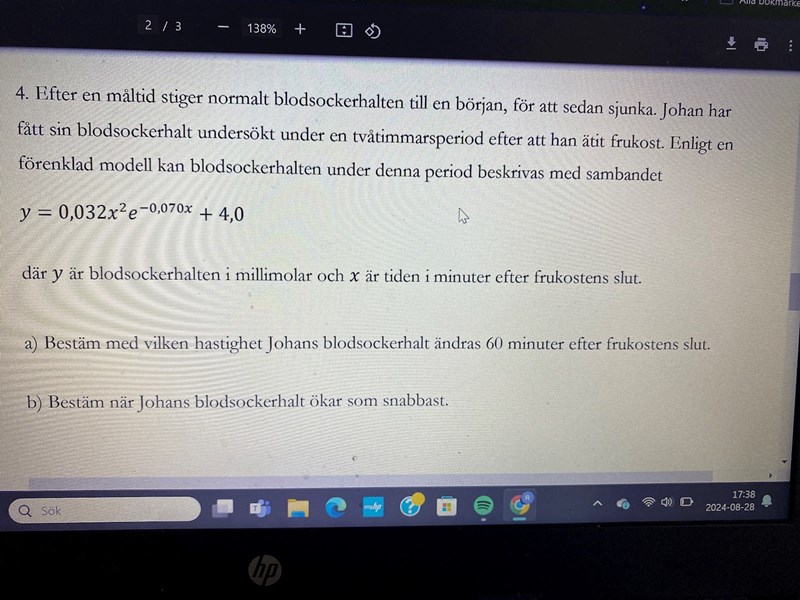 Du vill veta när blodsockeralten ökar som snabbast, d v s andraderivatan av y(t). Du behöver alltså derivera en gång till innan du sätter derivatan lika med 0.