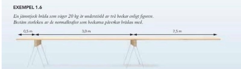Markera mitten på brädan (masscentrum), och rita ut de två normalkrafterna. Dessa normalkrafter försöker rotera brädan runt dess masscentrum, men åt olika håll eftersom de verkar på varsin sida om centrum. Eftersom brädan inte roterar, vet vi att de två vridmomenten som skapas är lika stora. Det kan uttryckas med en ekvation, där de två normalkrafterna ingår.