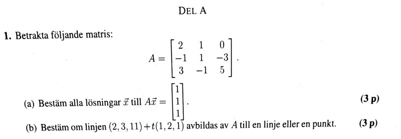 När jag löste a) så fick jag att systemet saknar lösningar då högerledet är lika med en konstant, medan VL har 0 rader. Men när jag löser endast matris A med hjälp av gausning så får jag att systemet har lösningen t(-1,2,1). Jag prövade tex att lösa A(x)=(2,3,11+1*1,2,1) ,men jag får att systemet saknar lösningar som i fallet med a)