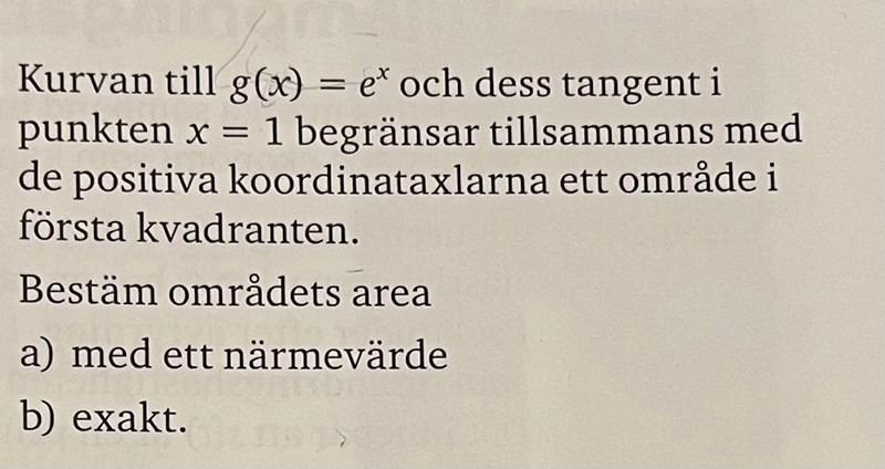 Jag håller på med denna uppgift som du kan se nedan. Jag tänkte lösa uppgiften genom att rita upp graferna, hitta integralens x-värden (de jag sätter ovanför och under integraltecknet) för det begränsade området, och sedan beräkna integralen och få fram ett svar som är områdets area. Problemet är att jag inte riktigt vet hur jag ska få fram tangentens funktion? Det jag tänkte var att de tangerar varandra på punkten (1, ex) men det känns fel, och även om det hade varit rätt så vet jag inte vad för användning jag hade haft av den infon. Jag uppskattar all hjälp och hoppas någon kan förklara för mig hur jag tar reda på tangentens ekvation.