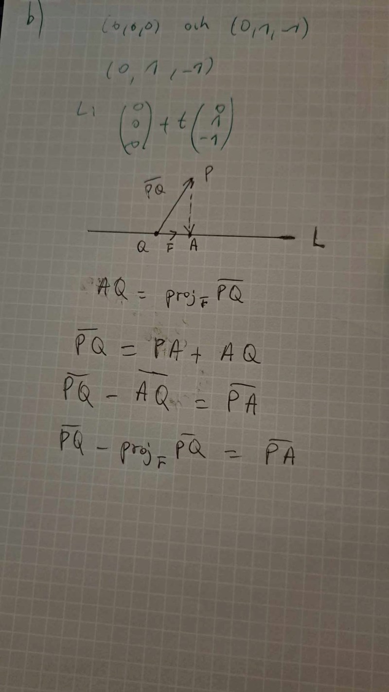 Den sökta projektionen är vektorn . Det är samma sak som vektorn eller . Det finns metoder där man väljer en godtycklig punkt på linjen, men då måste du ändå implicit räkna ut och i det här fallet är det krångligare tycker jag.