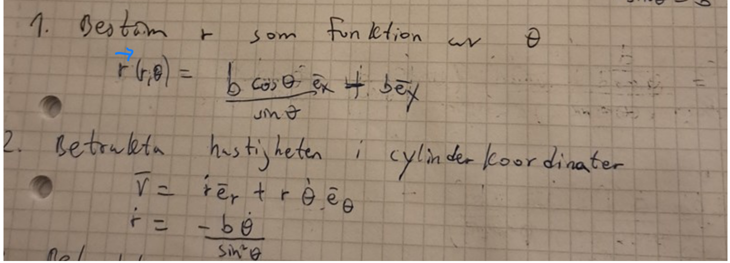 Fast du använder facits ekvation (1) och den vill jag inte använda för det var inte så vi började. Hela min fråga handlar om vår vektor r(r,theta) i kartesiska koordinater som vi började med.. Sen om du menar vår metod är fel men facits metod är rätt så får du gärna förklara varför ekvation (1) formulerades i facit. Justnu vill jag förstå vår metod som vi använde för att vi ska få samma svar som facit. Vi har rprick som -bw/sin^2theta men saknar rthetaprick i vår metod.