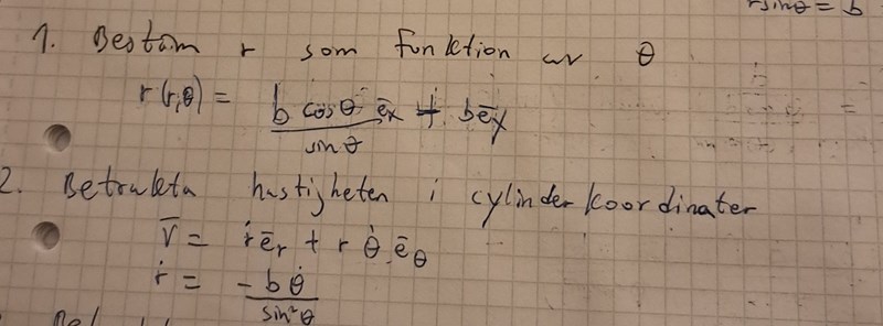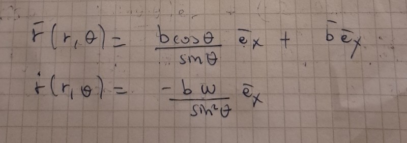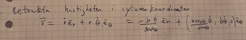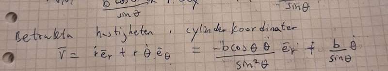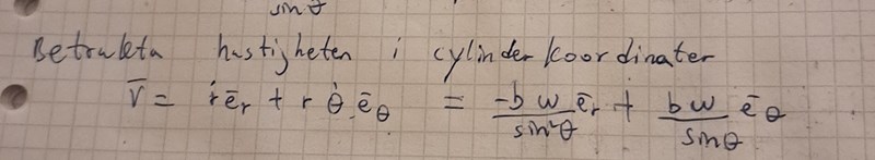 Ja men det är lite förvirrande för jag och facit har gjort olika. Jag hade r(r,theta)=bcostheta/sinthetaex+bey. Cylinderkoordinater för hastigheten ges ju som rpricke_r +rthetapricke_theta