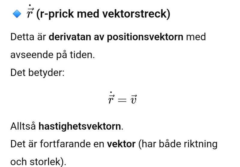 Så derivatan av en vektor är det jag beräknade medan derivatan av en skalär map tiden är det formeln syftar på när det gäller v och a i cylinderkoordinater? Om jag förstår dig rätt så har vi tagit fram en vektorfunktion för r men vi deriverar beloppet av den där r map tiden?