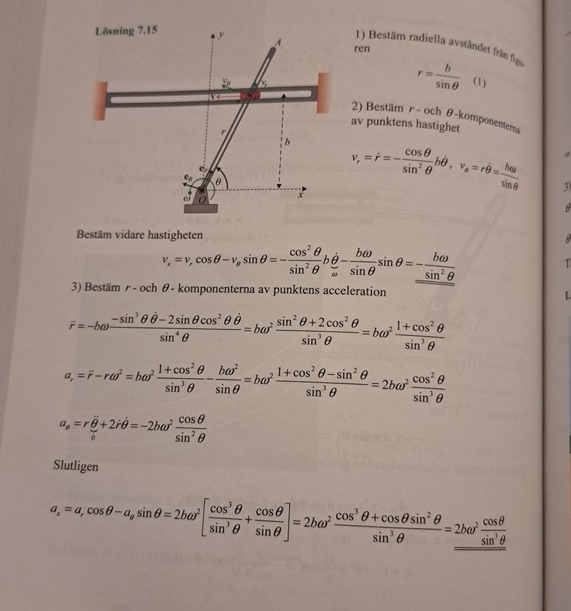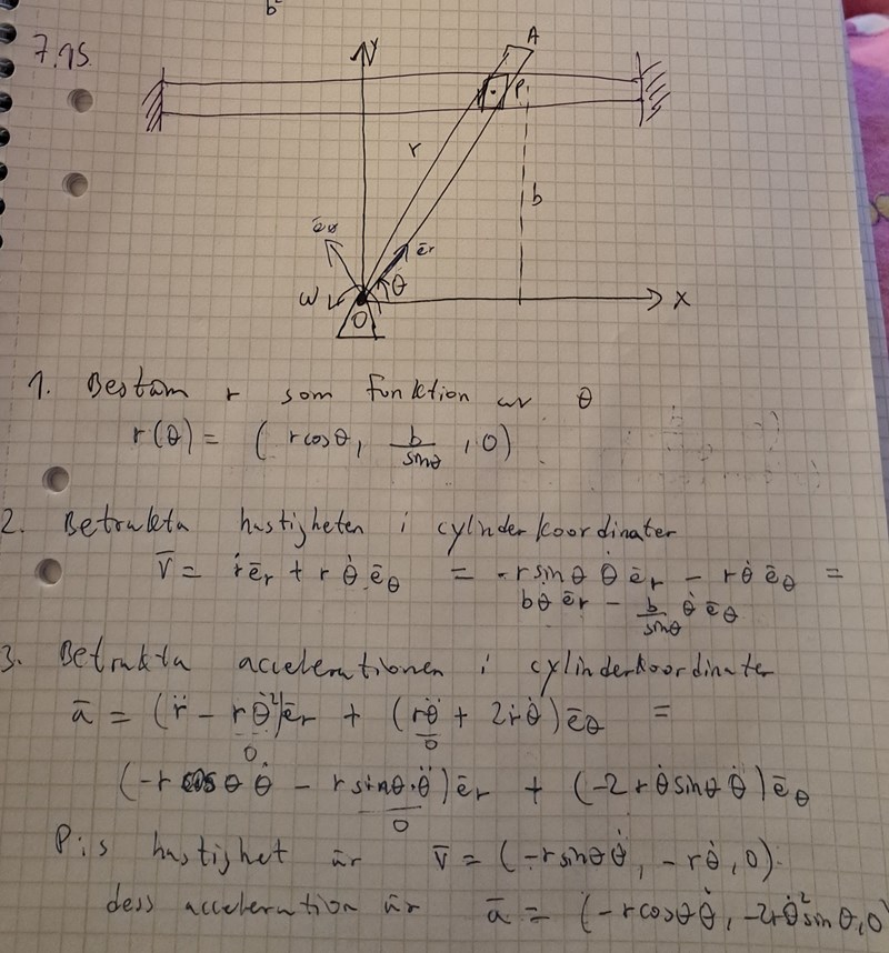 Det är därför jag stör mig på facits svar på P:s haastighet och acceleration. De kan inte säga till oss om de är ute efter x komponenten eller y komponenten av v eller den generella hastigheten i cylinderkoordinater. Det makear inte sense att bara räkna ut vx och ax utan någon skäl. De har dock blandat in e_r och e_theta för att få fram vx.