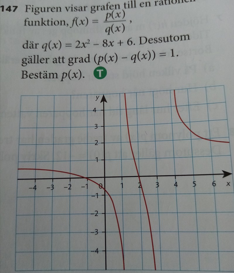 Jag försökte bestämma f(x) med hjälp av funktionens nollställen för att sedan multiplicera med q(x), men jag vet inte om funktionen har bara 2 nollställen eller fler. Om grad (p(x)-q(x)) = 1 då borde väl p(x) vara en tredjegradare? Men enligt facit är p(x) en andragradare.