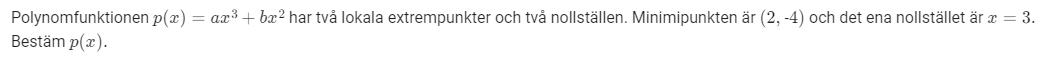 Du vet att , vi vet också att det finns en extrempunkt på koordianterna (2, -4). Du får här två till ekvationer.