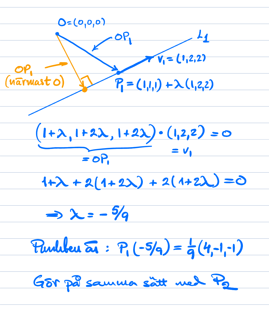 Om O=(0,0,0) så är P1 på linjen närmast origo då OP*v1=0.