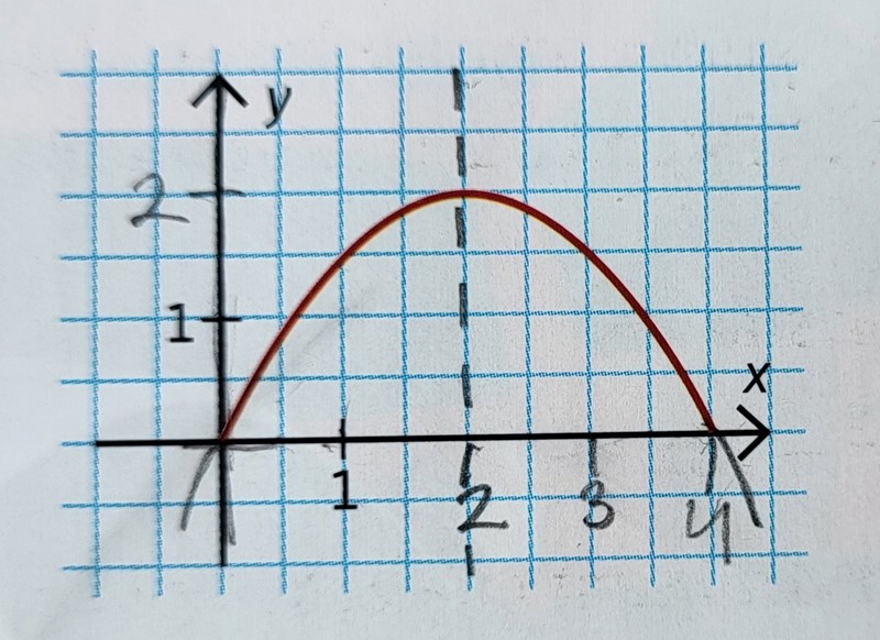 Stämmer. Det enklaste du skulle kunna göra nu är att skriva funktionen som f(x) = kx(x-4) och använda punkten (2,2) för att beräkna k. (Det visar sig att k = -0,5.)